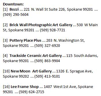 The numbers correspond to the gallery names on the main listing page. (any number not listed represents a previous gallery that is no longer participating) All galleries & shops are located within 20 minutes from the center of town. These maps give an overall view of the area ~ for specific directions use the gallery address in your GPS. Also available... ... [Spokane Maps ~ North, East & South]